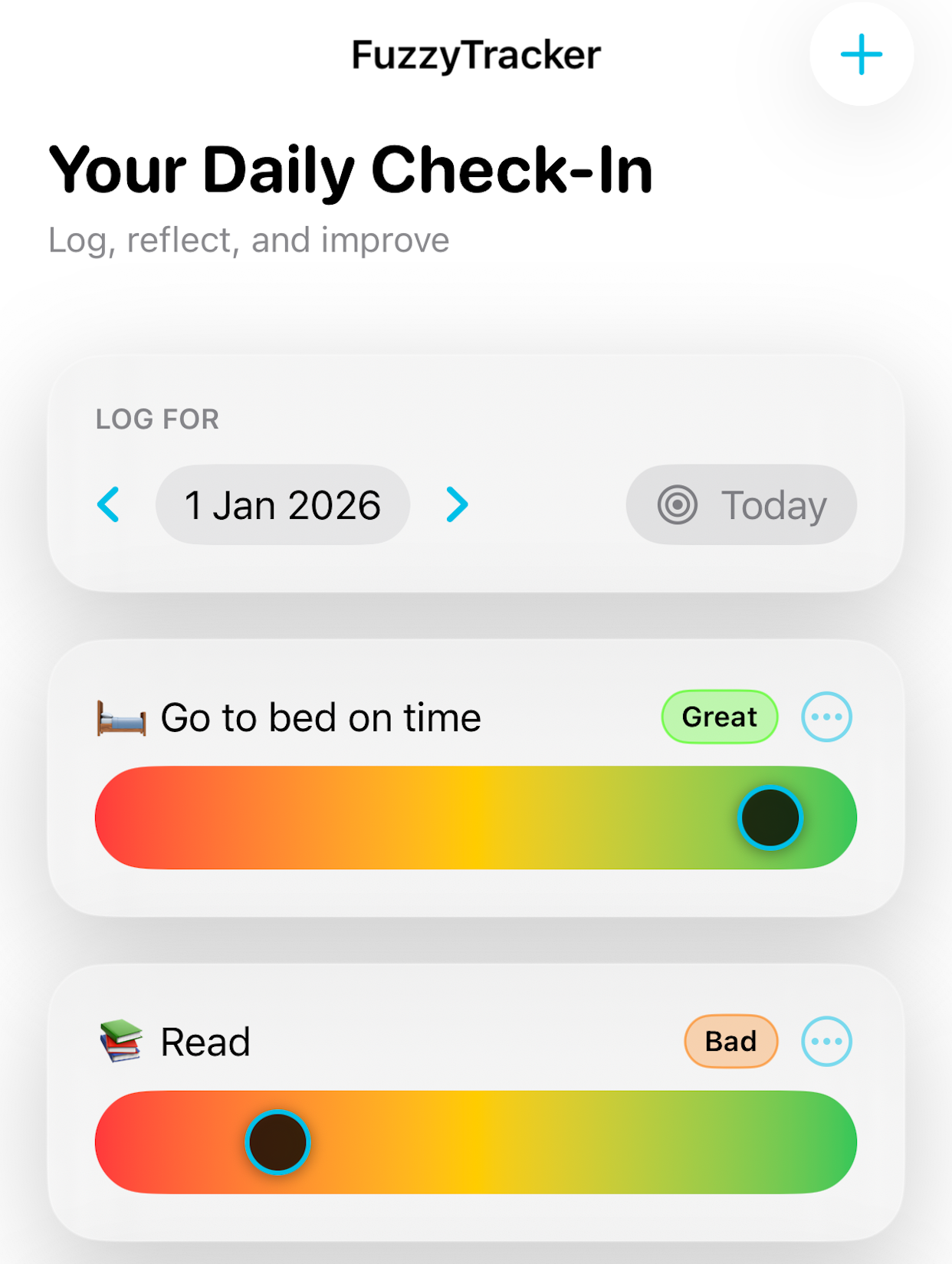 Life isn’t binary. Fuzzy Tracker lets you score your day on a spectrum — so you can keep momentum, see real progress, and stop feeling “all or nothing” when you miss a day.